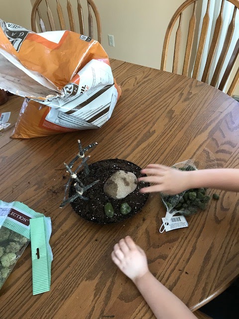 This was a really cool project to do with my darling girl. I like the looks of the garden and I like that it is a fairly constant reminder of what Lent is all about. It sits right on our dinner table so we have some really good conversations about Lent and Jesus' death and resurrection. Yesterday, for example, we had a whole discussion of how painful Jesus' death must have been. I think it's awesome that my little girl and I can just randomly start discussing our faith.